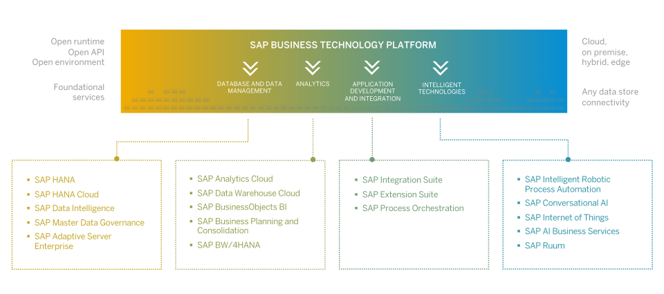 - Business Technology Platform: It is made up of a holistic of SAP solutions such as Database & Data Management, Analytics, Application Development & Integration and Intelligent Technologies.