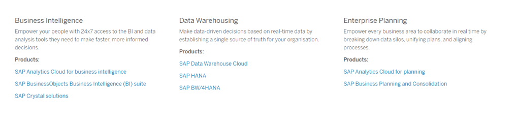 You can receive more information regarding the solutions that are offered as part of the analytics in the following link https://www.sap.com/australia/products/analytics.html