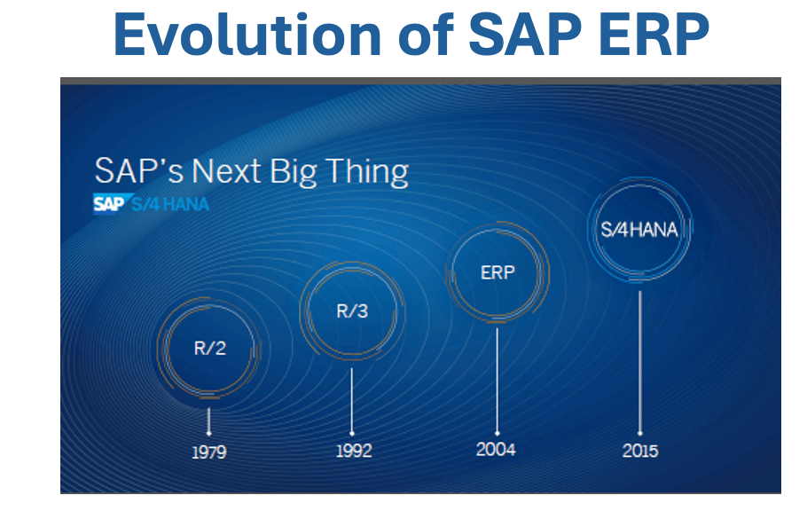 In 1979, they released an ERP software called R/2. It was based on Mainframe, then in 1992, they released R/3. Which was based on a client/server architecture. And in 2004, SAP released ECC which stands for ERP Central Component. ECC has been very popular and used by thousands of organisations globally. It is supported by SAP until 2027 and the customers can purchase extended maintenance until 2030 but after that, they have no choice but to transition to S/4HANA which was released in 2015 and it is SAP’s latest core ERP software.