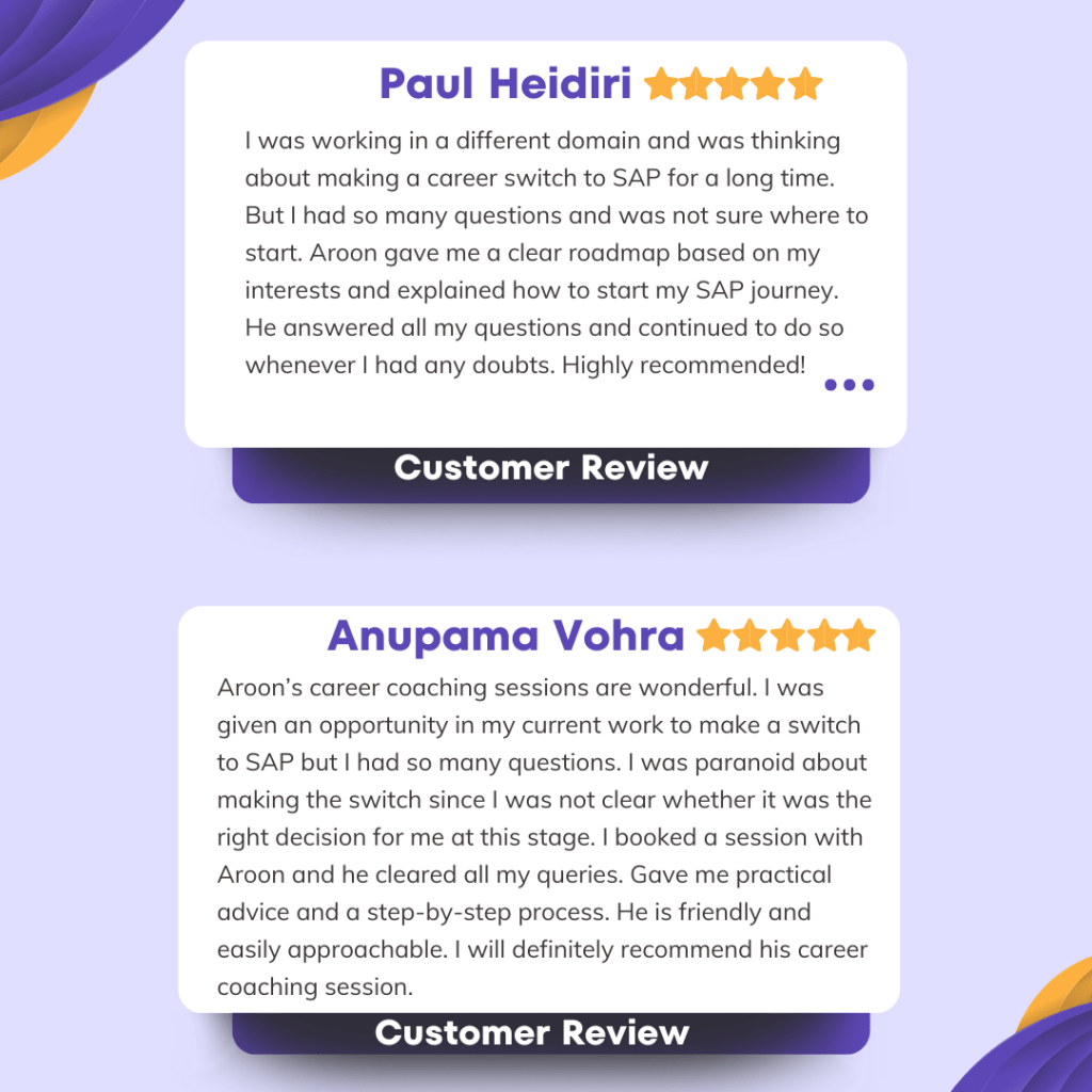 By having a personalised coaching session with me, I can offer you personalized insights to untangle your doubts and set you on a strategic path. Together, we’ll navigate through the vast SAP landscape, addressing your unique concerns and crafting a roadmap tailored to your dreams without breaking the bank and wasting your precious time.